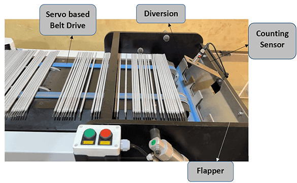The Electrodes are transferred through Servo based belt drive, the sensor mounted above belt drive counts the electrodes while dropping. The number of electrodes are settable on HMI screen, as the set number of electrodes gets completed the diversion unit mounted between two flapper units gets actuated with the help of pneumatic cylinder.