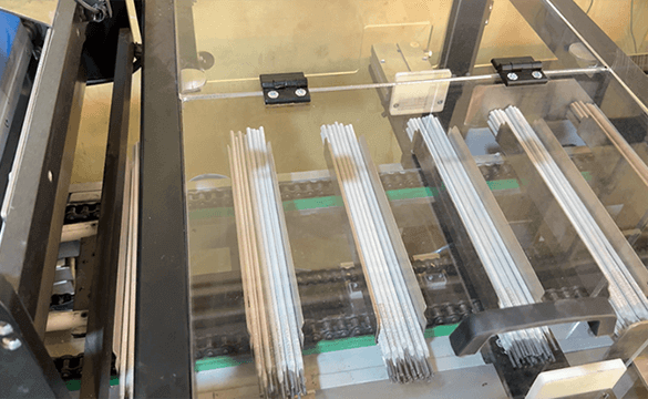 Once the electrodes get dropped inside the pocket it is transferred through chain drive through servo motor for accuracy and sensitive to overload, during transferred the electrodes are properly guide from both sides by the pneumatic cylinder. The electrodes are settled properly inside the pocket by vibrators that are mounted below pocket and also parallel guided from top side so that it does not exceed the height of carton.