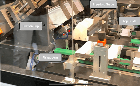 Individual cartons are picked from the carton magazine by an oscillating carton pickup unit. The mechanical carton pickup assembly has two arms that oscillates and position 2 suction cups to the front carton. The pickup operation is servo driven for proper formation of carton. Carton pickup assembly place carton between carat angle and carton chain. The carton is forced open by the pressure against the feed guides and moving carton chain attachment.